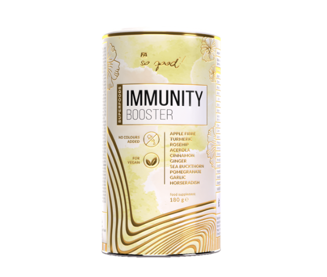 Ainesosat: Omenakuitu, kurkumajuurijauhe (Curcuma longa L.), ruusunmarja-uute (Rosa canina L.), acerola-hedelmäuute (Malpighia glabra L.; 25% C-vitamiinia), kanelijauhe (Cinnamomum cassia), inkiväärinjuurijauhe (Zingiber officinale), tyrnimarjajauhe (Hippophae rhamnoides L.), kirsikkajauhe (Prunus cerasus L.), karpalouute (Vaccinium macrocarpon Aiton), goji-marjajauhe (Lycium barbarum L.), granaattiomenajauhe (Punica granatum L.), murskattu valkosipuli (Allium sativum L.), seljanmarja-uute (Sambucus nigra L.), piparjuurijauhe (Armoracia rusticana P. Gaertn., B. Mey. Et Scherb.), guavajauhe (Psidium guajava L.), vadelmajauhe (Rubus idaeus L.), acaimarjajauhe (Euterpe oleracea) [80 mg], baobab-hedelmäjauhe (Adansonia digitata L.), mustikkajauhe (Vaccinium corymbosum L.), mansikkajauhe (Fragaria ananassa Duchesne ex Weston) [30 mg], mustikkajauhe (Vaccinium myrtillus L.) [20 mg], porkkanajauhe (Daucus carota L.) [19,5 mg], oliiviöljypulveri Hytolive® (Olea europaea L.) [0,5 mg]*.