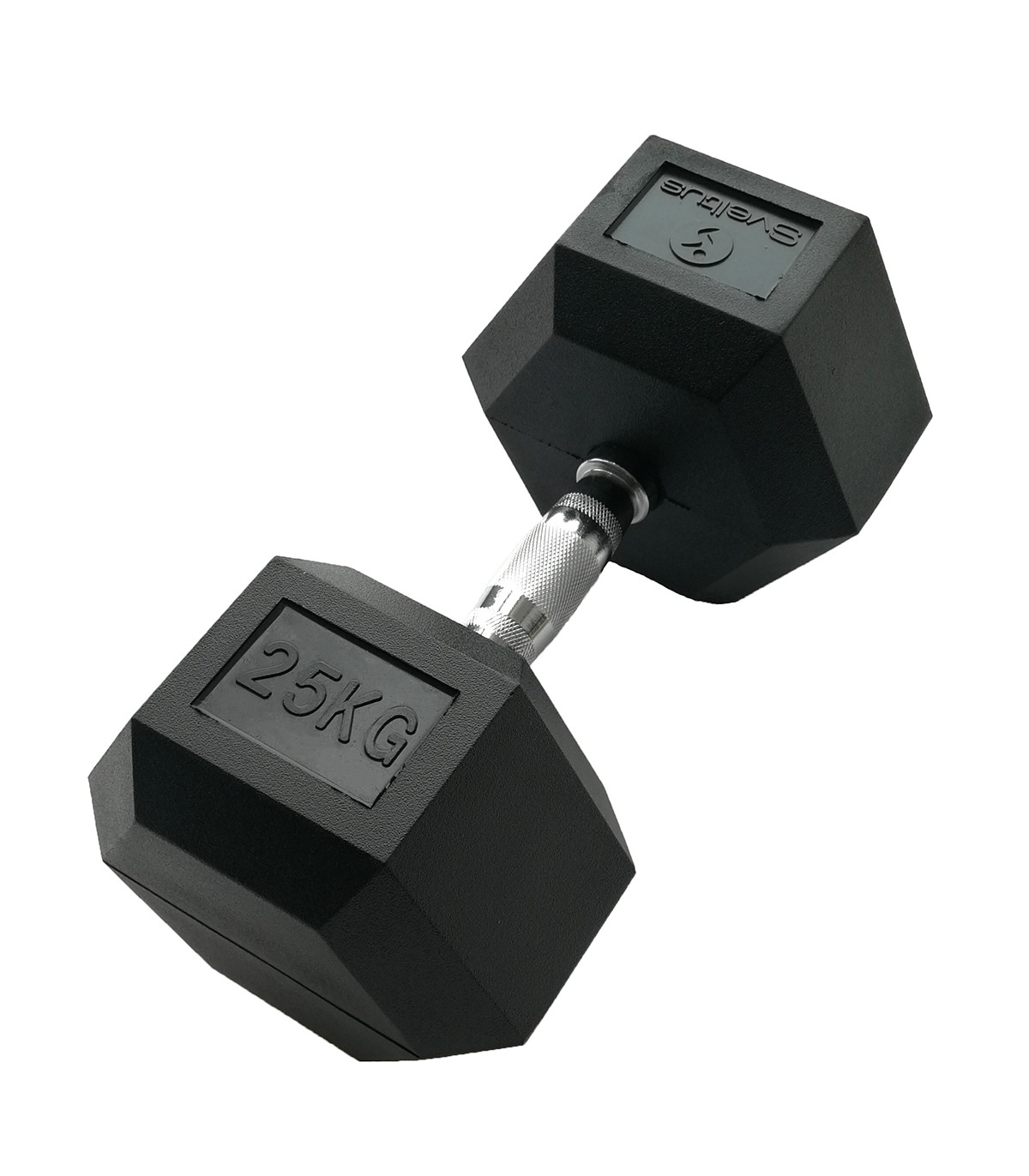 Kuusikulmaiset käsipainot painolla 1 kg - 50 kg. Kuusikulmainen muoto estää sen pyörimisen (6 sivua). Ne on päällystetty erittäin kestävällä ja kestävällä kumikerroksella, joka suojaa sitä iskuilta ja vähentää melua. Ergonominen kromattu kahva liukumattomalla alueella täydellistä otetta varten.